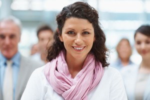 Business group with focus on attractive executive standing in fr Business leadership – Group with focus on attractive executive standing in front